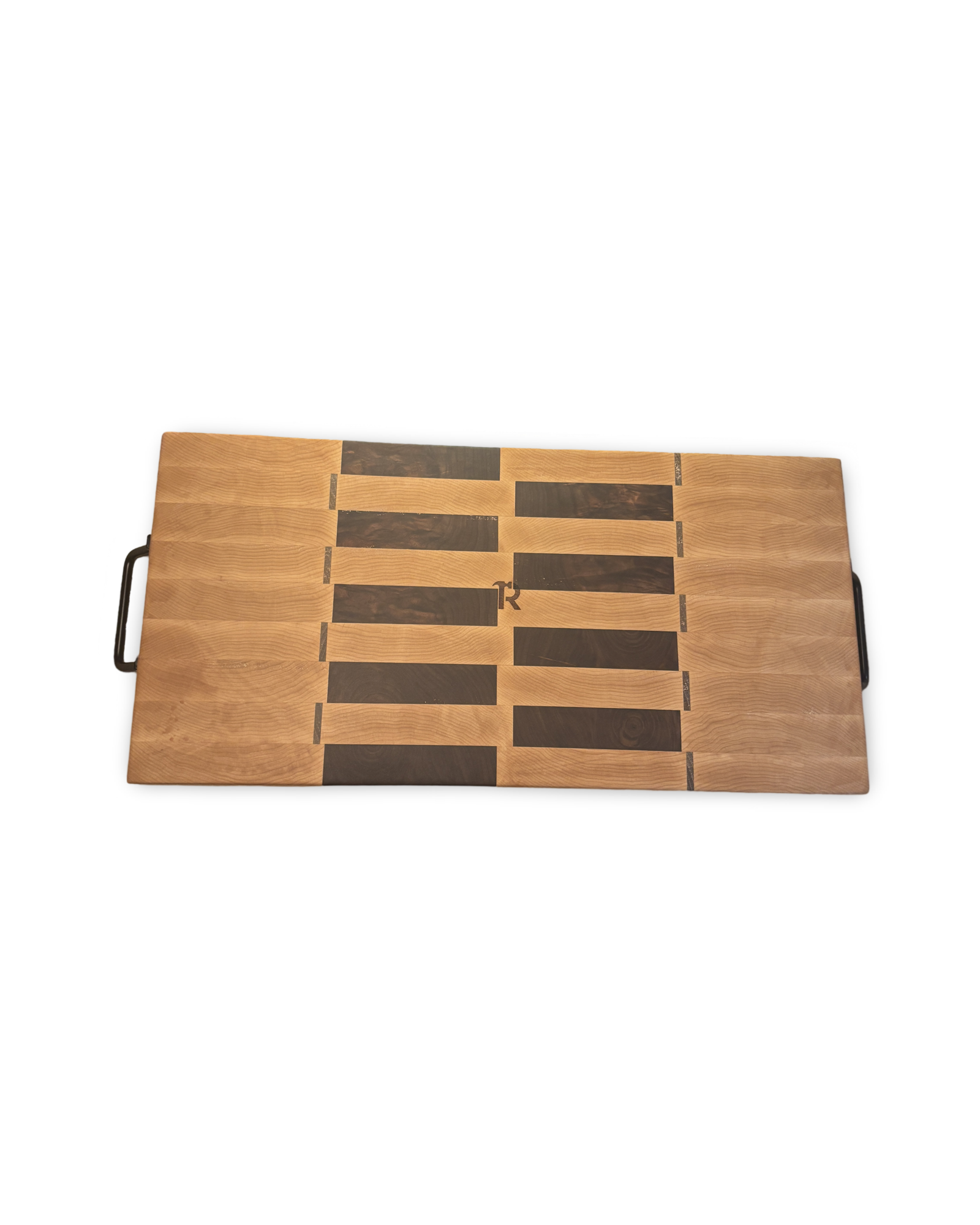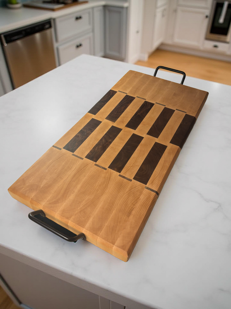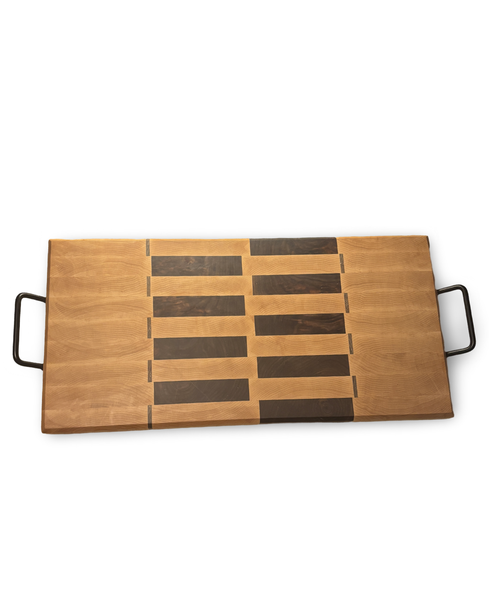 Introducing “The Chop Ladder”, a bold and functional statement piece for your kitchen or dining table. Handcrafted from premium hardwoods, this large rectangular cutting and serving board showcases a striking, ladder-like pattern of rich walnut set against warm, maple. Sturdy black metal handles on each side make it easy to carry, perfect for serving charcuterie, bread, or a feast of appetizers in style.